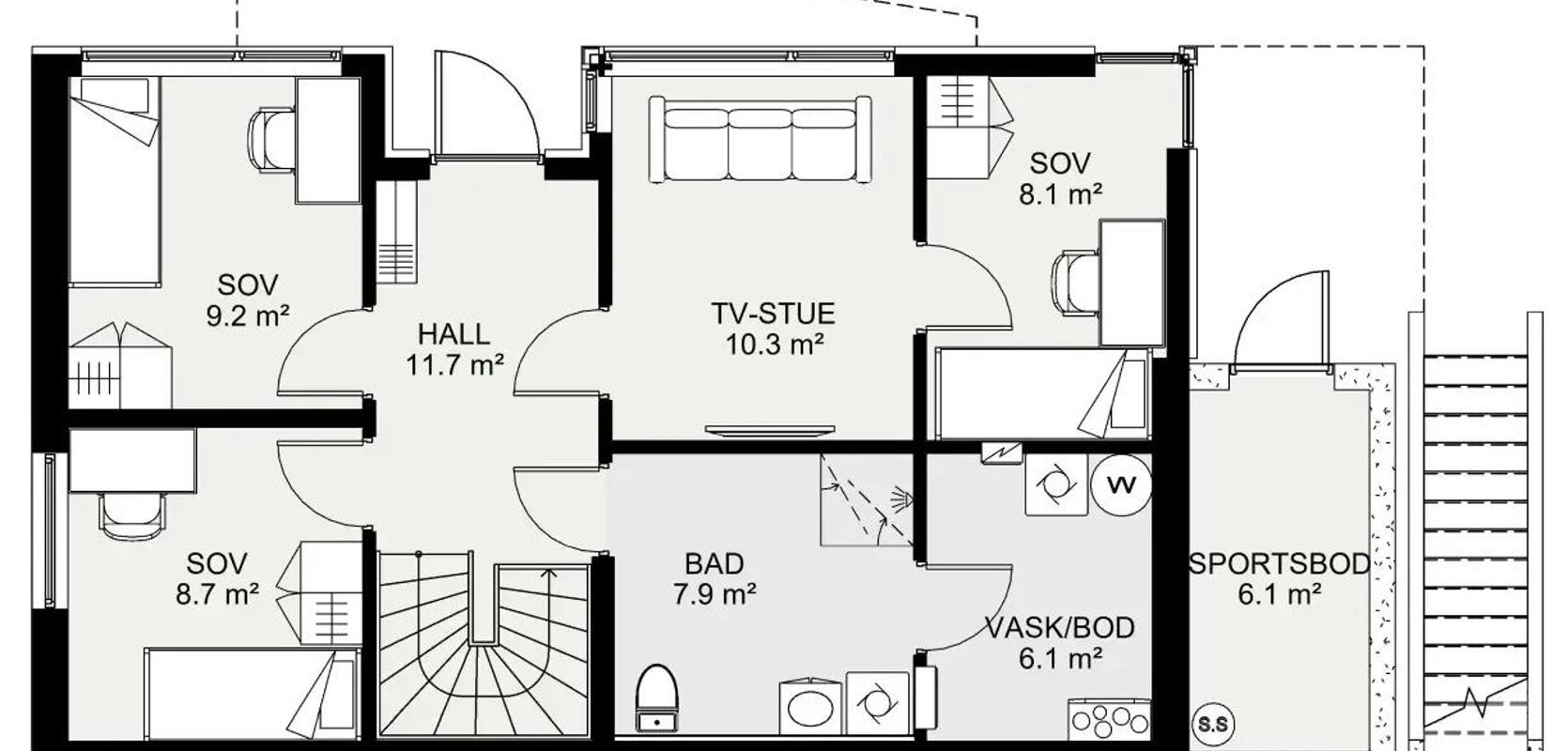 Signatur 308 er spesielt tilpasset en skrå tomt, og hovedinngangen er plassert i underetasjen. Under balkongen på hovedplanet finner du en romslig hall med inngang til en tv-stue, et stort bad med tilgang til eget vaskerom og to praktiske soverom. Det tredje soverommet ligger innenfor tv-stuen. På utsiden er det også en egen sportsbod, perfekt for oppbevaring av sportsutstyr eller hagemøbler.