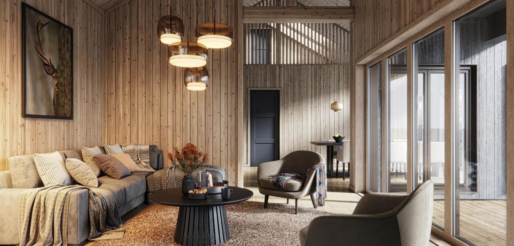 Hytta har en eksklusiv atmosfære med en mønehøyde på 6,2 meter over spiseplassen, noe som gir rikelig med naturlig lys. Oppe på hemsen er det godt med lys, og en spilevegg i tre, som går fra gulv til tak, gir en god forbindelse ned til stue, spisestue og kjøkken. På hemsen finner du også et rom som kan brukes for ekstra soveplasser.
